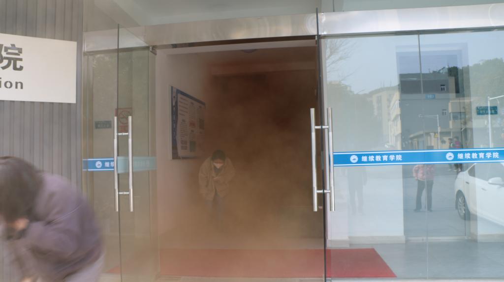 接着在一阵急促的警报声响后,办公楼开始浓烟弥漫。听到警报声,全体教职工按照弯腰、靠墙、捂口鼻等要领,沿着安全疏散的标识有序撤离到安全地带。